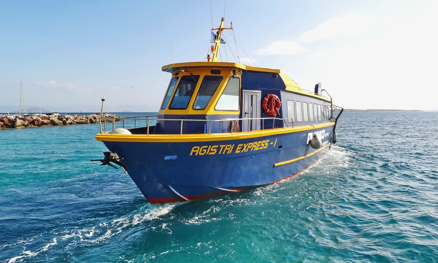 The bus leaves from immediately outside the Arrivals’ doors. Purchase your ticket, which will be about 6 euro at the kiosk in the airport or, if this is closed, on the bus itself. The journey will take approximately one hour and a quarter and terminates at Piraeus, within one minute’s walk of Gate 8.